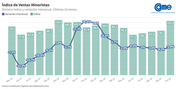 En octubre, las ventas minoristas pymes mostraron una leve mejora mensual, aunque continuaron por debajo del nivel del año anterior. La mayoría de los rubros registró caídas interanuales, con “Perfumería” y “Bazar y decoración” entre los más afectados. Las promociones y el Día de la Madre impulsaron transitoriamente la demanda, sin revertir la tendencia general de consumo prudente. Los comercios encuestados destacaron mayores costos operativos, baja rentabilidad y escaso acceso al financiamiento. Predomina la cautela en las expectativas y la baja disposición a invertir. Para acceder al informe completo, haga clic aquí.