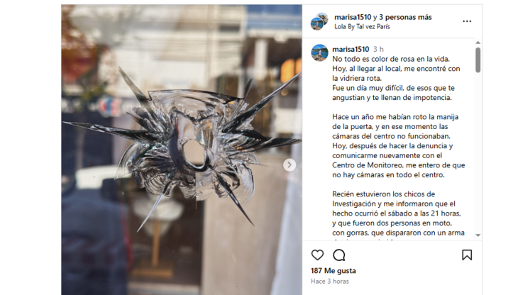 Según posteó en sus redes marisa1510 "al llegar al local, me encontré con la vidriera rota. Hace un año me habían roto la manija de la puerta, y en ese momento las cámaras del centro no funcionaban. Hoy, después de hacer la denuncia y comunicarme nuevamente con el Centro de Monitoreo, me entero de que no hay cámaras en todo el centro".
