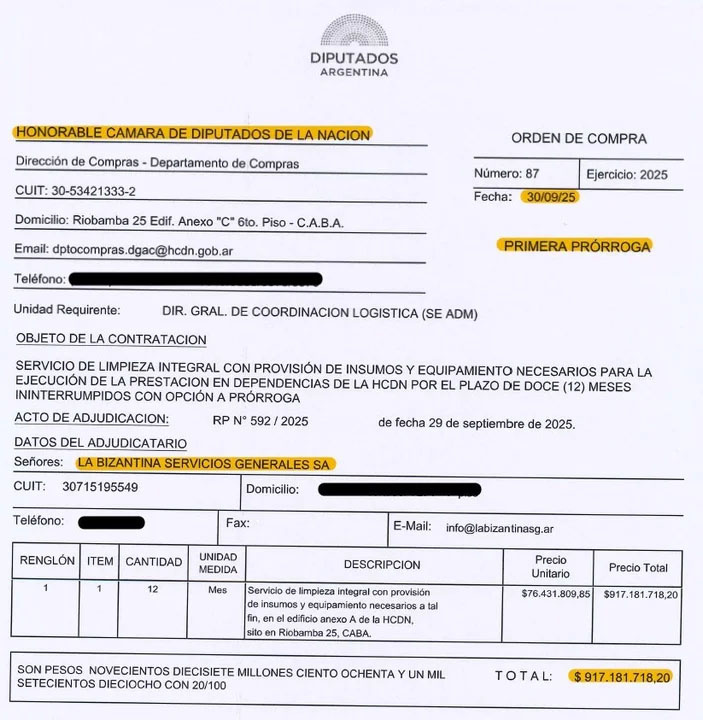El 1 de julio de 2024, el Congreso abrió una compulsa para contratar un “servicio de limpieza integral” con "provisión de insumos y equipamiento necesarios para la ejecución de la prestación en dependencias de la Honorable Cámara de Diputados de la Nación (HCDN) por el término de 12 meses”. El 5 de septiembre del mismo año, Martín Menem firmó su adjudicación y le otorgó la porción más grande de la torta a La Bizantina, de la familia de Hazaff. La compañía embolsó $694.782.000 por esa licitación.