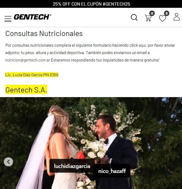 La pista de la nutricionista es mucho más reveladora. La trama se desenvuelve a partir de Gentech, una exitosa empresa de suplementos perteneciente al clan riojano y de la que Martín Menem todavía posee el 21% de las acciones. La compañía designó como su nutricionista de cabecera a la licenciada Lucía Díaz García, cuyo nombre figura en la sección de “consultas nutricionales” de la página web de la firma. Pues bien: resulta que la profesional es nada más y nada menos que la esposa de Hazaff, con quien contrajo matrimonio en 2024.
