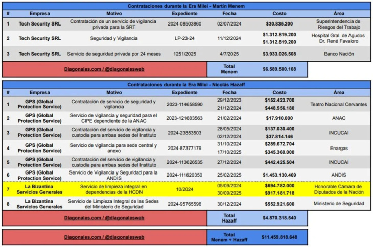 Todas estas adjudicaciones han sido investigadas y monitoreadas de forma pormenorizada por Diagonales desde que estalló la controversia por aquella escandalosa contratación del Banco Nación a Tech Security en julio de 2025. En base a esos datos, el cálculo realizado por este medio arroja que, en conjunto, Martín Menem y Nicolás Hazaff ganaron licitaciones por $11.459.818.648 durante la Era Milei. Un revival de los ‘90 que, curiosamente, repite apellidos, métodos y, de paso, beneficiarios.