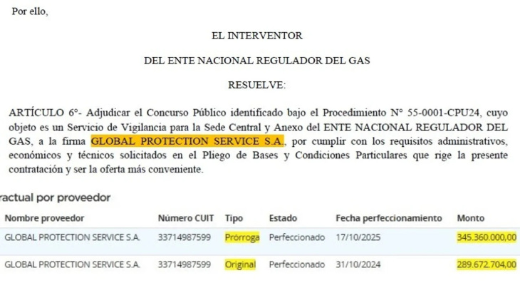 Casualmente o no tanto, esas dos licitaciones en las que habría reemplazado a Tech Security fueron, en ambos casos, prorrogadas. Una de ellas, impulsada por el Teatro Nacional Cervantes, acumula $600 millones y vence pronto, en diciembre de este año. La otra, ordenada por el Enargas, fue prorrogada hace menos de un mes: el 17 de octubre, Día de la Lealtad Peronista. Se trata de un “servicio de vigilancia” para la sede y el edificio anexo de la entidad y, hasta ahora, suma unos nada desdeñables $635 millones para los Hazaff.