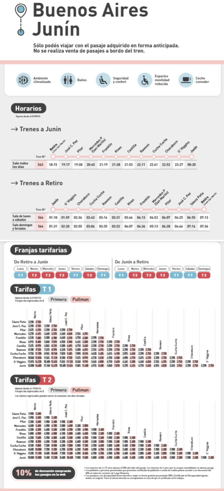 Sale un servicio diario que parte de Retiro a las 18:15 y retorna a la 1:10 de lunes a sábados y a la 1:31 domingos y feriados. El precio de los pasajes del tren a Junín se modificará de acuerdo al día en el que el pasajero desee realizar el viaje. Habrá dos bandas tarifarias. Para conocer el valor de cada pasaje se puede consultar el archivo que aparece aquí debajo, o la web de Trenes Argentinos.