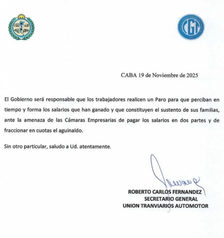 "Venimos a informar la gravísima coyuntura económica, financiera y operativa que atraviesa actualmente el sector del transporte automotor de pasajeros en todo el país, situación que ha generado un quiebre absoluto del equilibrio económico, tornando materialmente imposible sostener en tiempo y forma el pago íntegro y contemporáneo de las obligaciones salariales del personal", agregaron en la carta.