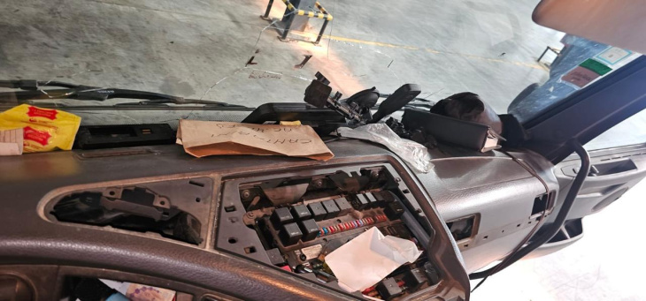 Al momento de la inspección, los funcionarios revisaron el sector de la cabina, notando la presencia de objetos ocultos dentro del plástico, hallando finalmente 10 kilos 905 gramos de cocaína y 199 pastillas de metadona, un opioide sintético que se utiliza principalmente bajo supervisión médica y que no es apto para consumo personal.