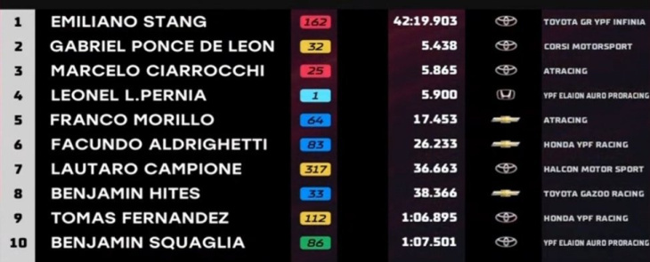 Emiliano Stang consiguió vencer con el Toyota Corolla Cross SUV en el Martín Miguel de Güemes, un resultado que le permite llegar al Gran Premio Coronación de Junín con chances para disputar el título con su compañero Matías Rossi, quien abandonó. Segundo terminó el juninense Gabriel Ponce de León y tercero Marcelo 'Chelo' Ciarrocchi.