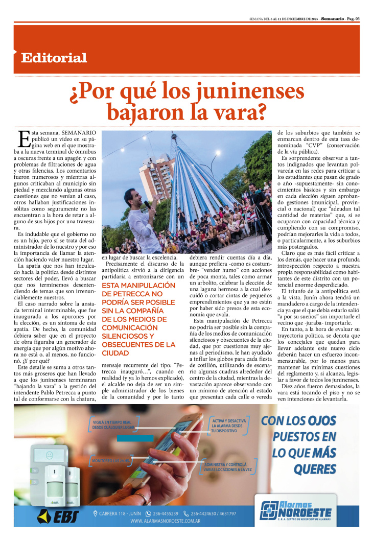 EDITORIAL PUBLICADO EN LA EDICIÓN IMPRESA Y EDICIÓN DIGITAL Nº 492 DE SEMANARIO DE JUNÍN. SEMANA DEL 6 AL 12 DE DICIEMBRE DE 2025