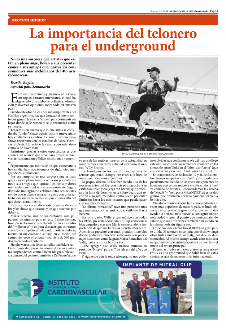 SECCIÓN HIPHOP PUBLICADA EN LA EDICIÓN IMPRESA Y EDICIÓN DIGITAL Nº 493 DE SEMANARIO DE JUNÍN. SEMANA DEL 20 AL 26 DE DICIEMBRE DE 2025