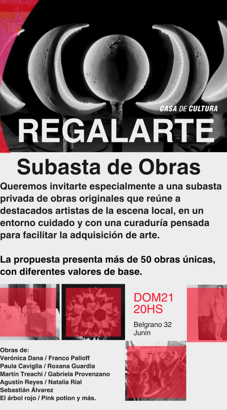 Los días 20 y 21 de diciembre, de 18 a 00 h, en Casa de Cultura Cluster, ubicada en Belgrano 32 de Junín se realizará el micro festival “Regalarte”, una propuesta cultural abierta al público que reúne arte, diseño, objetos únicos y espectáculos, con la posibilidad de adquirir una pieza de arte para toda la vida.