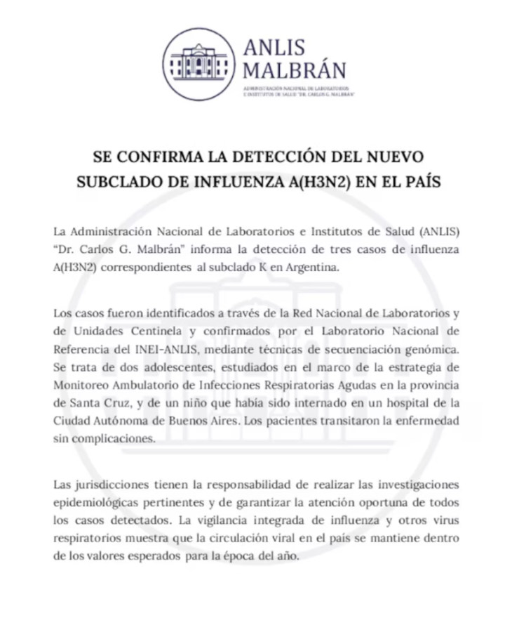 El avance de la vigilancia epidemiológica encendió una nueva señal de atención en el país. En las últimas horas, el Instituto Malbrán confirmó la detección de los primeros tres casos en Argentina del subclado K de la gripe A (H3N2), una mutación del virus de influenza que ya había sido registrada en otros países de la región y que es seguida de cerca por las autoridades sanitarias por su mayor capacidad de transmisión.