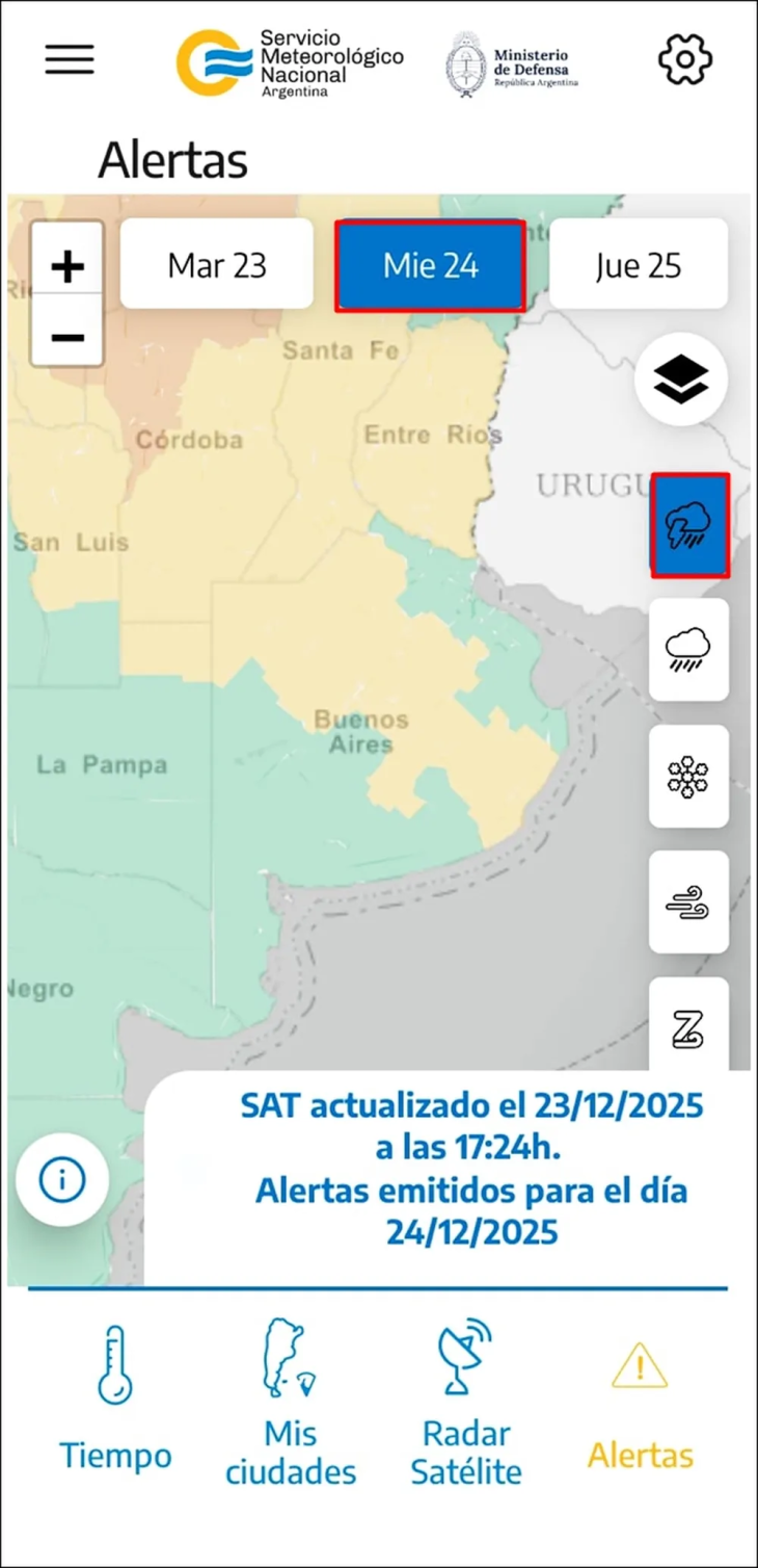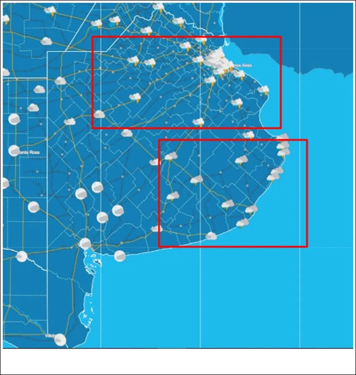De acuerdo al mapa interactivo que muestra la evolución climática durante el día, la noche del 24 registrará chaparrones en el Área Metropolitana de Buenos Aires (AMBA) y en los distritos del centro y sudeste provincial.