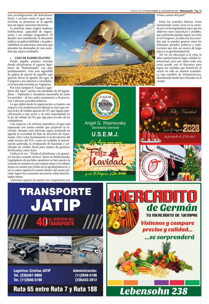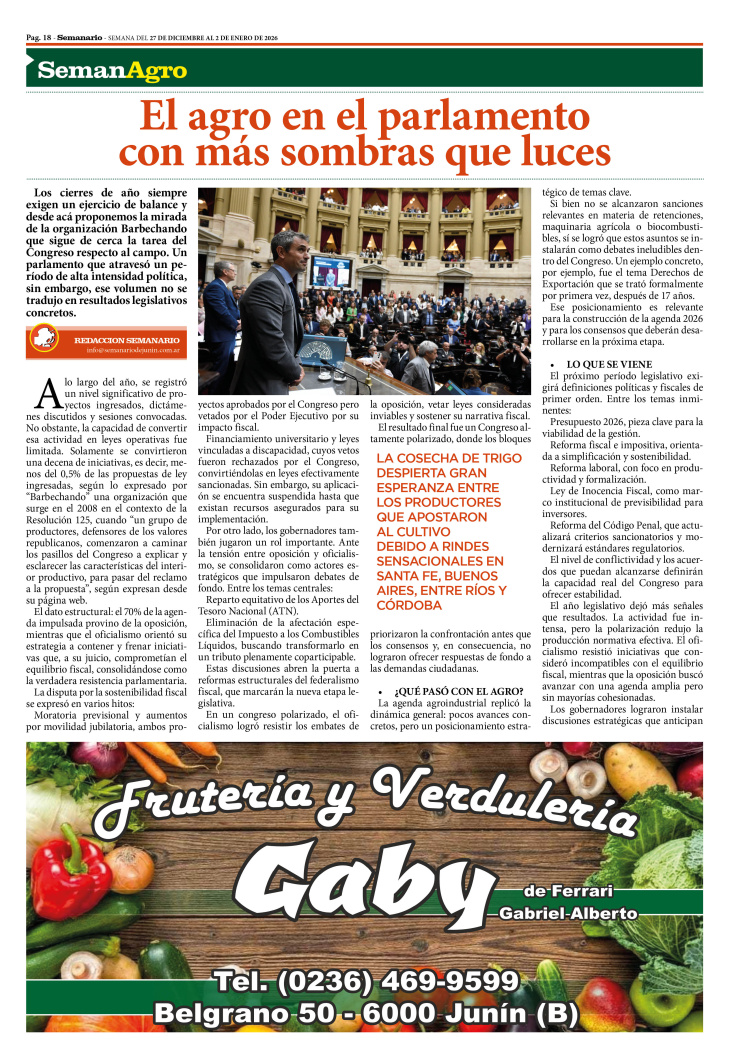 SECCIÓN SEMANAGRO PUBLICADA EN LA EDICIÓN IMPRESA Y EDICIÓN DIGITAL Nº 494 DE SEMANARIO DE JUNÍN. SEMANA DEL 27 DE NOVIEMBRE DE 2025 AL 2 DE ENERO DE 2026