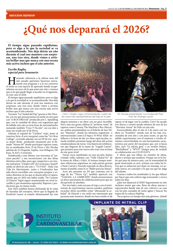 SECCIÓN HIPHOP PUBLICADA EN LA EDICIÓN IMPRESA Y EDICIÓN DIGITAL Nº 494 DE SEMANARIO DE JUNÍN. SEMANA DEL 27 DE DICIEMBRE DE 2025 AL 2 DE ENERO DE 2026