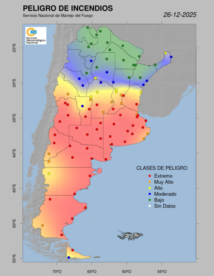 Lo cierto es que Mar del Plata es una de las localidades en mejor situación de acuerdo al mapa elaborado por Servicio Nacional de Manejo del Fuego. Como muestra la imagen de más abajo, casi todo el territorio bonaerense está clasificado con nivel de peligro extremo para hoy y las próximas 72 horas.
