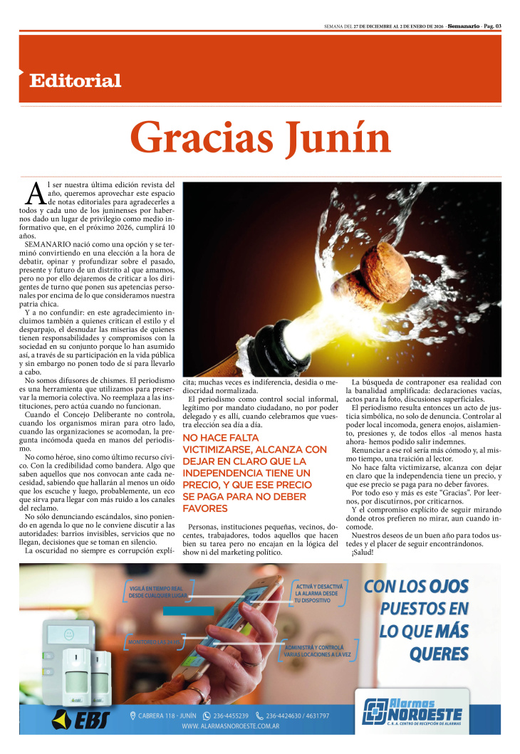 Al ser nuestra última edición revista del año, queremos aprovechar este espacio de notas editoriales para agradecerles a todos y cada uno de los juninenses por habernos dado un lugar de privilegio como medio informativo que, en el próximo 2026, cumplirá 10 años.