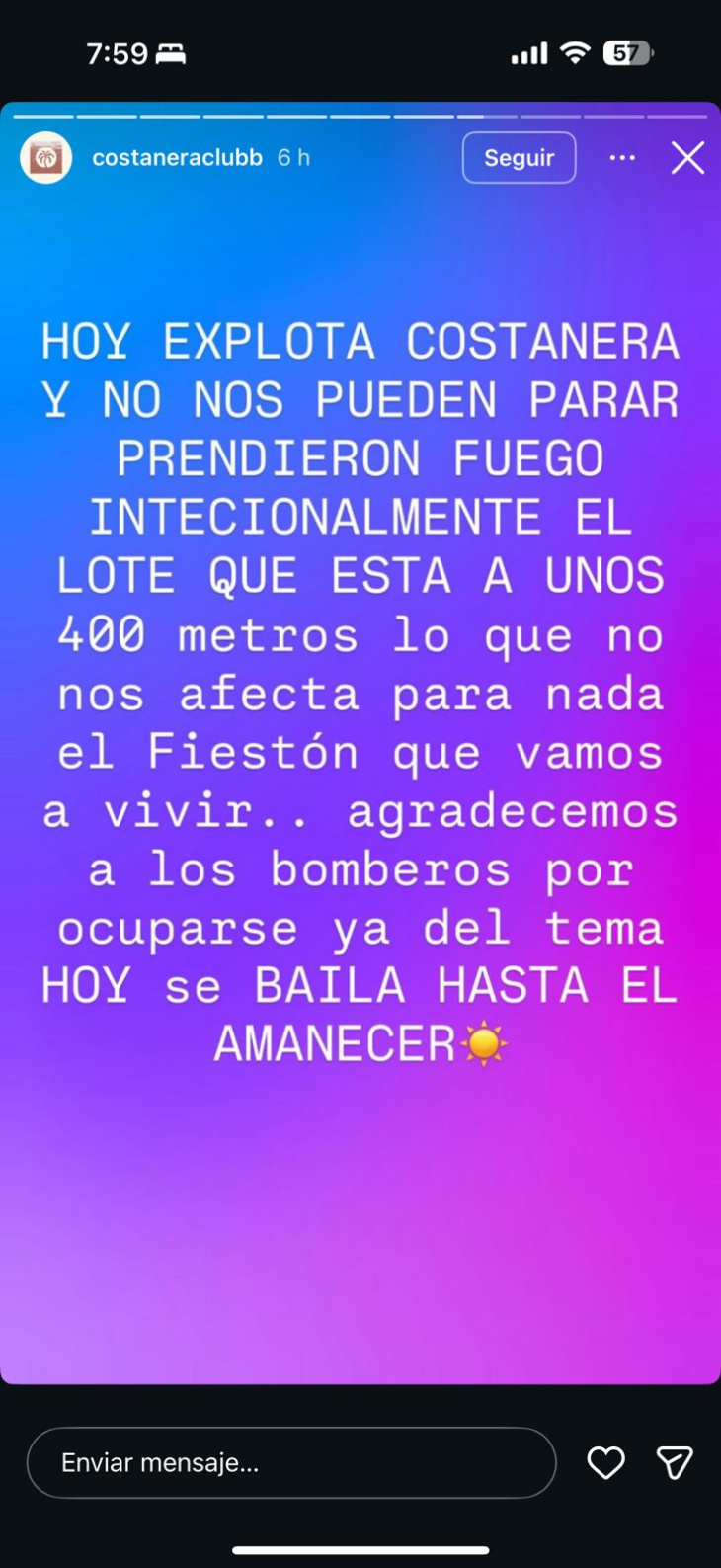 Como único aviso, el boliche emitió un comunicado culpando a la competencia del incendio. "Fue intencional, pero igual hoy se baila hasta el amanecer" expresaron. Y mientras adentro era pura diversión, a pocos metros las llamas avanzaban sin que ninguna autoridad tomara cartas en el asunto.