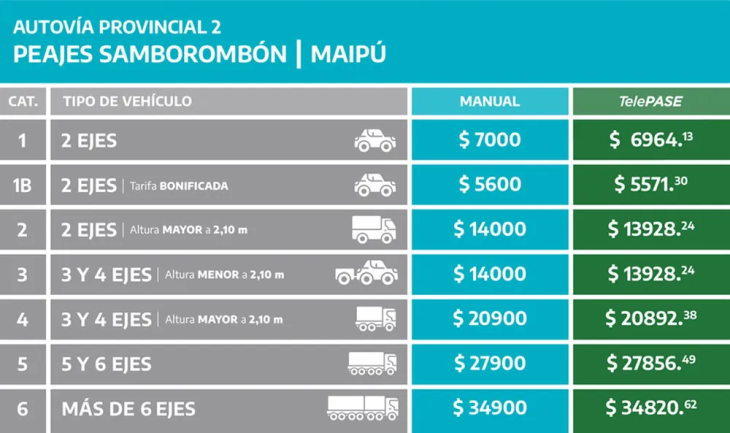 El recorrido desde la Capital Federal hacia Mar del Plata implica el paso por cuatro cabinas de peaje. Primero, los de Dock Sud y Hudson, sobre la autopista Buenos Aires–La Plata. Luego, ya sobre la Ruta 2, se suman los peajes de Samborombón y Maipú. Cada uno de estos últimos costará actualmente $7000, mientras que los primeros dos suman en conjunto $4.400, siempre en hora pico.