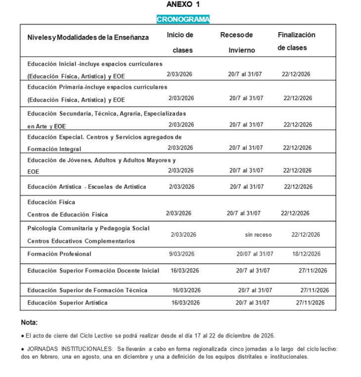 La resolución también fija la realización de cinco jornadas institucionales a lo largo del ciclo lectivo: dos en febrero, una en agosto, una en diciembre y una adicional a definir por los equipos distritales e institucionales. Asimismo, se establece que el acto de cierre del ciclo lectivo podrá realizarse entre el 17 y el 22 de diciembre.