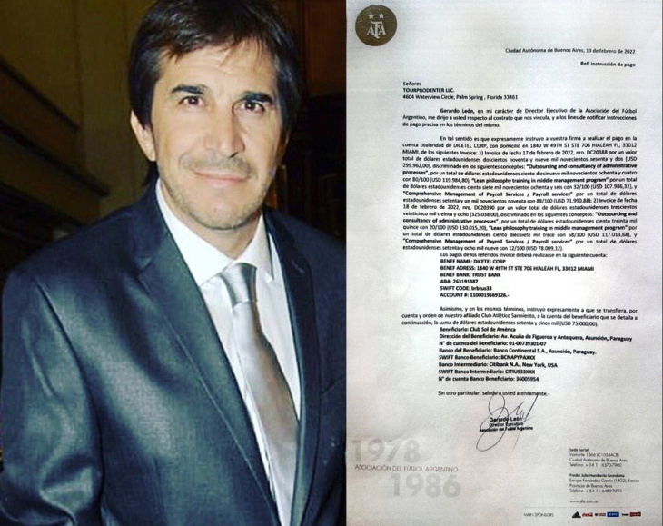 Después nombrar a Tourprodenter LLC -del productor teatral y ex diputado del Frente Renovador de Sergio Massa, Javier Faroni- como representante en el exterior, la AFA le dio una instrucción de un primer pago por un total de 625 mil dólares a favor de Dicetel.