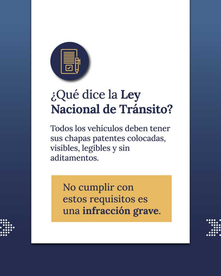 También establece que, si un vehículo circula sin patente o la lleva en un lugar incorrecto, no puede continuar su marcha hasta regularizar la situación.