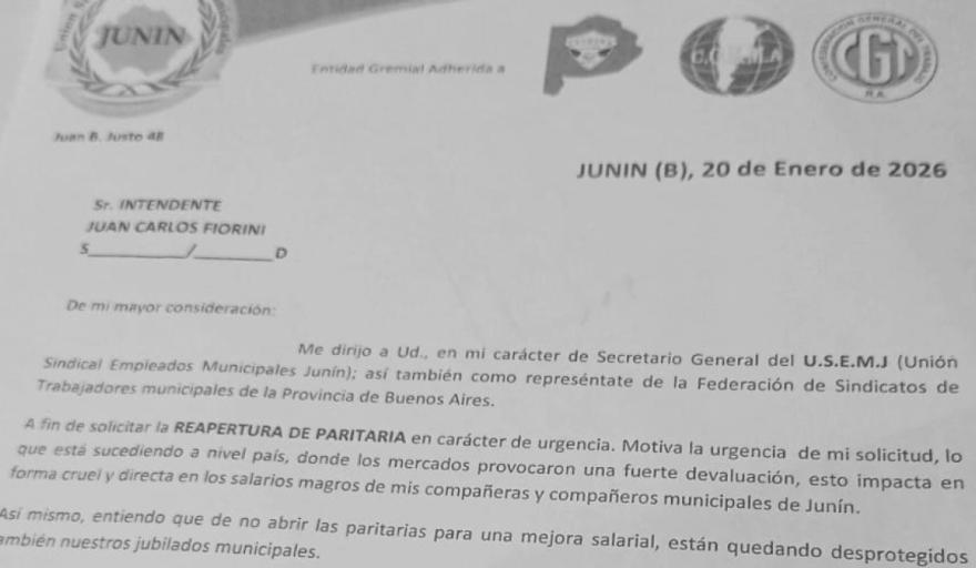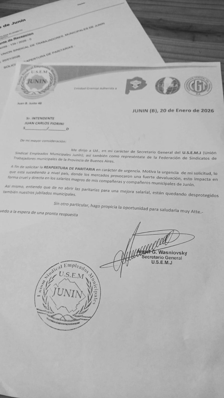 La Unión Sindical de Empleados Municipales de Junin (USEM) presentó una nota formal al interino Juan Carlos Fiorini, solicitando la REAPERTURA URGENTE DE LA PARITARIA SALARIAL
