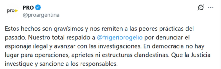 Nuestro total respaldo a Frigerio por denunciar el espionaje ilegal y avanzar con las investigaciones”, expresó la fuerza política liderada por Mauricio Macri en un comunicado difundido en redes sociales.