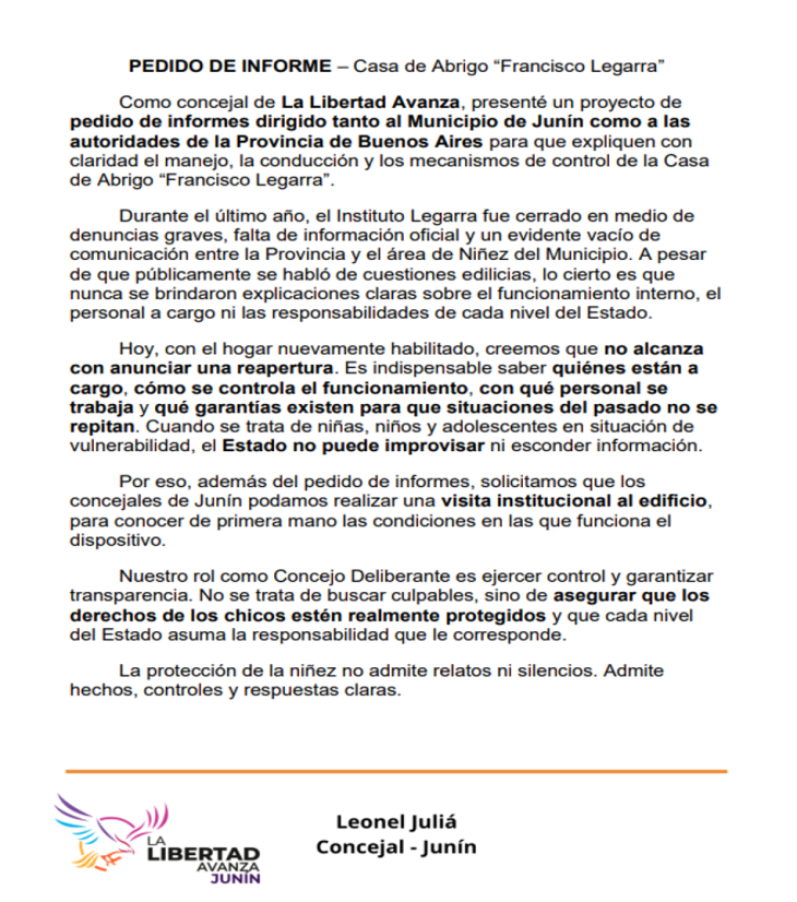 Luego que se diera a conocer las recientes informaciones que la Casa de Abrigo “Francisco Legarra” se encuentra nuevamente habilitada para su funcionamiento y para la recepción de menores de edad con medidas de abrigo dispuestas por la autoridad competente, desde el bloque de concejales de LLA Junín solicitaron al Municipio local, a través de una nota dirigida a la Presidente del Cuerpo Agustina de Miguel que se informe 'clara, actualizada y verificable' las condiciones en que se produjo dicha reapertura, los recursos humanos asignados, las responsabilidades de cada nivel del Estado y los mecanismos de control y resguardo de derechos de niñas, niños y adolescentes.