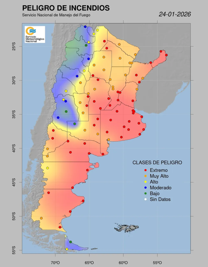 En este contexto de calor extremo, los riesgos sobre posibles incendios en campos bonaerenses suben. De hecho de acuerdo al reporte del Servicio Nacional de Manejo del Fuego (SNMF) y el SMN hay “riesgo extremo de incendios” en varias provincias argentinas y puntualmente en casi todos los municipios bonaerenses.