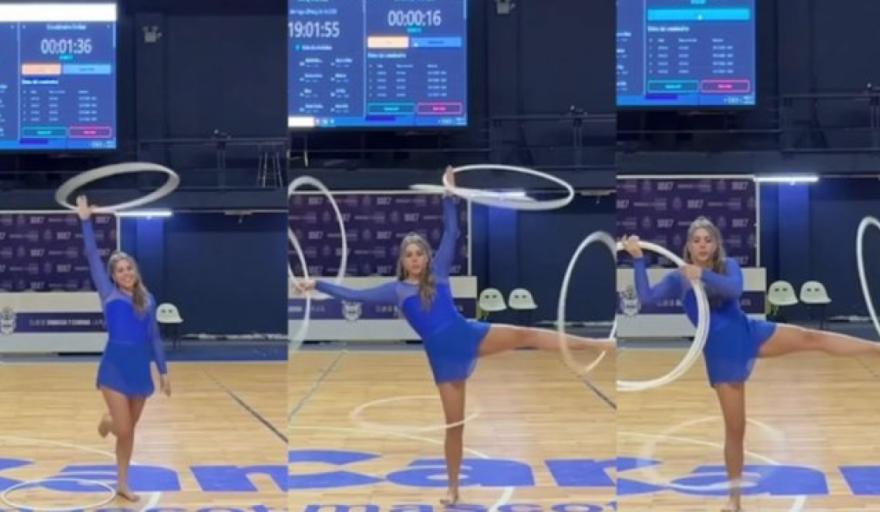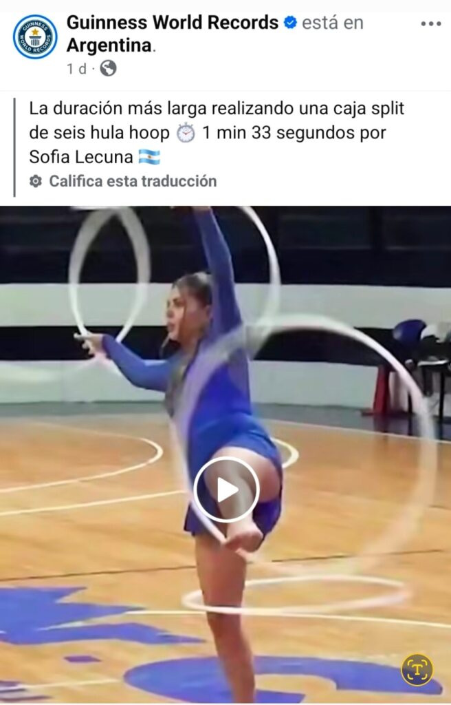 Sofía logró sostener durante 1 minuto y 33 segundos seis hula hoop mientras realizaba una caja split, una posición acrobática que combina fuerza, equilibrio y resistencia extrema.