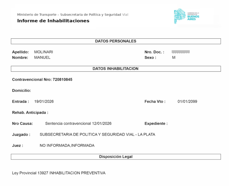 Según el acta del operativo, el mismo día del siniestro se hizo la extracción de sangre a los conductores para su análisis toxicológico: a las 22 fue el turno de Quirós, a las 22:15 el de Molinari y a las 22:30 el del padre de Bastián. Esas muestras fueron las que se cotejaron este lunes y por las cuales el Ministerio de Transporte bonaerense ahora confirma la inhabilitación para conducir de Molinari y Quiros.