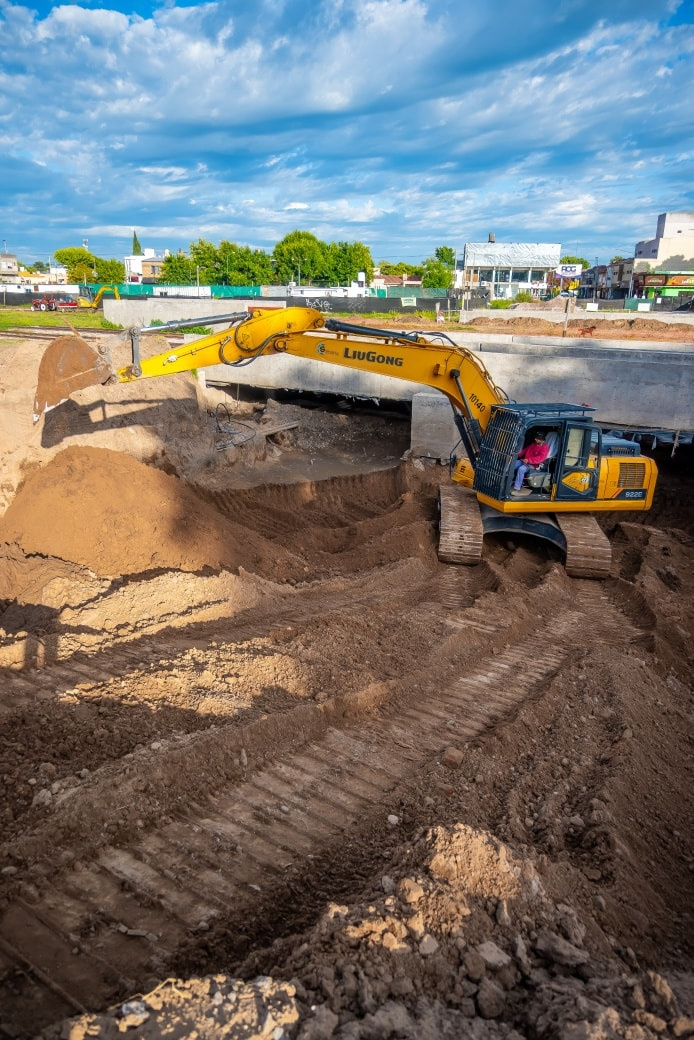 Ya va la tercera “tapa” de medios afines y gacetillas municipales anunciando la “prueba de carga” en el paso bajo nivel, mientras una grúa y una retroexcavadora trabajan en el lugar con un personal activo de no más de cuatro o seis personas.