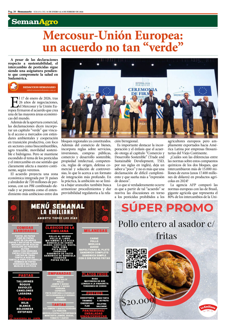 El 17 de enero de 2026, tras 26 años de negociaciones, el Mercosur y la Unión Europea firmaron el acuerdo que crea una de las mayores áreas económicas del mundo. Además de la apertura comercial, las declamaciones dicen incorporar un capítulo “verde” que vincula el acceso a mercados con estándares ambientales y cooperación en transición productiva, con foco en sectores como biocombustibles, agro trazable, movilidad sostenible e hidrógeno. Pero se mantiene escondido el tema de los pesticidas y el intercambio en ese sentido que claramente afecta a nuestro continente, según veremos.