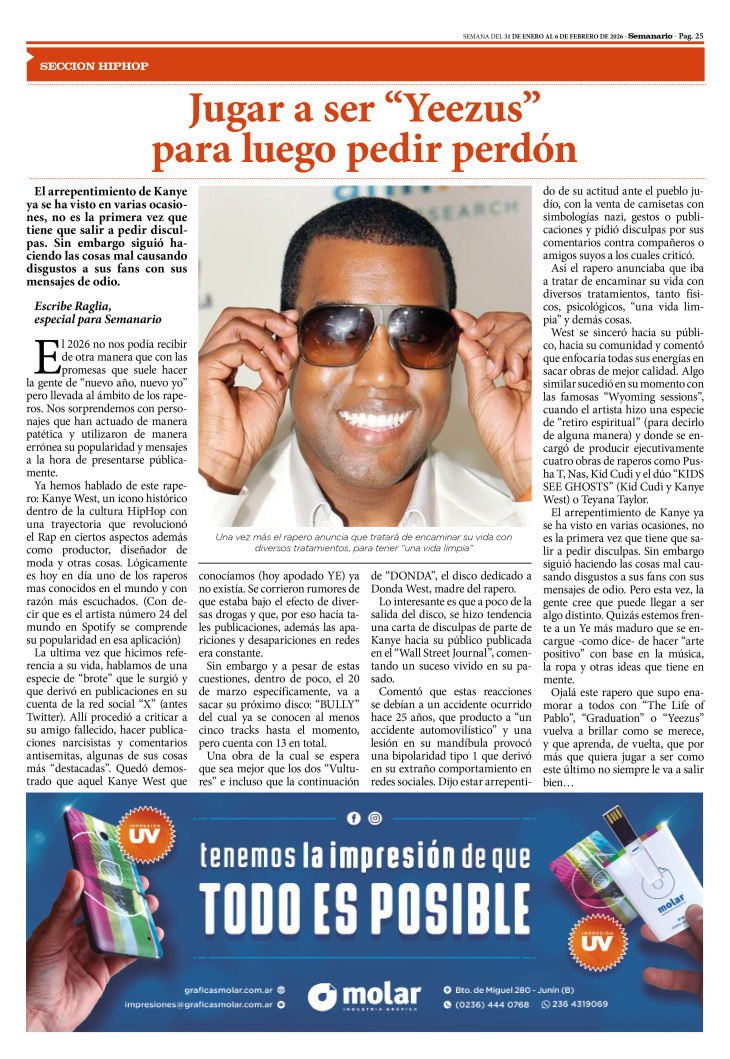 SECCIÓN HIPHOP PUBLICADA EN LA EDICIÓN IMPRESA Y EDICIÓN DIGITAL Nº 499 DE SEMANARIO DE JUNÍN. SEMANA DEL 31 DE ENERO AL 6 DE FEBRERO DE 2026