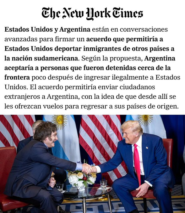 El entendimiento, detalla la nota, convertiría a la Argentina en un país puente: permitiría a Washington enviar a ciudadanos extranjeros a Buenos Aires, para que después se les ofrecieran vuelos para regresar a sus países de origen.