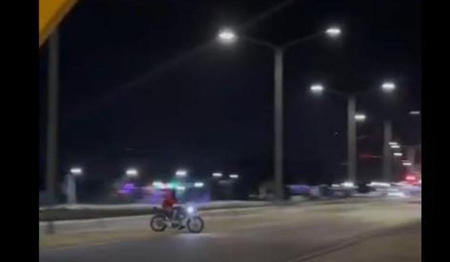 Allí se observa que dos o tres policías en motos llegan al lugar donde se halla un grupo de motociclistas presuntamente causando desmanes. Ante la fuga de dos de ellos uno de los efectivos policiales comienza a disparar balas de goma contra, sin considerar que hay otros autos estacionados y personas en la cercanía.