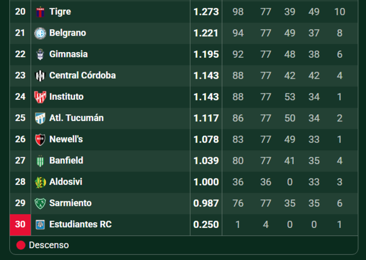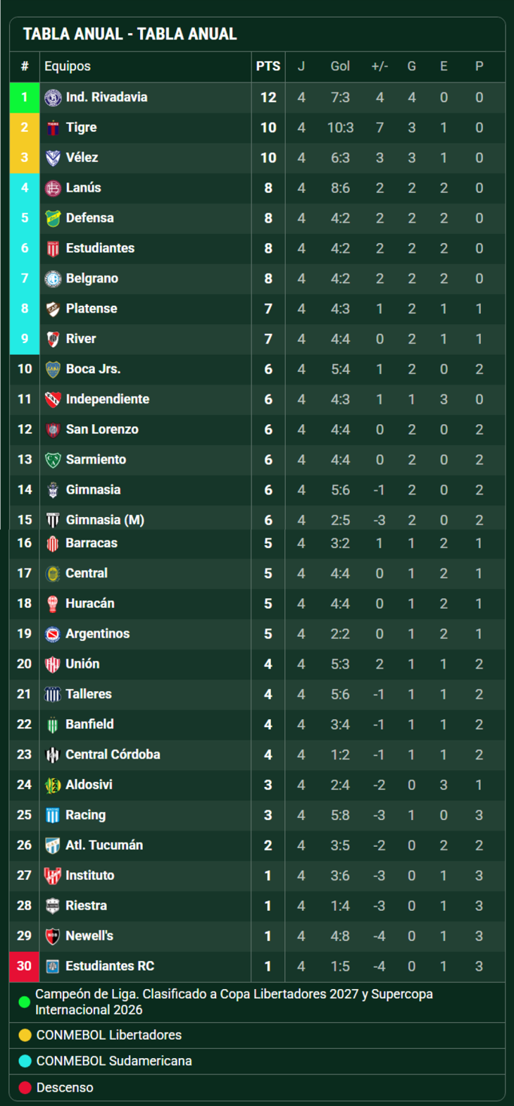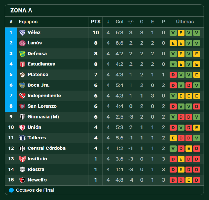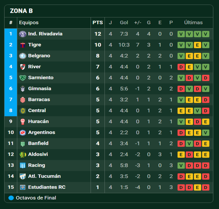 Cerrada la cuarta fecha del Apertura, y tras la victoria ante Atlético Tucumán, Sarmiento quedó ubicado en puestos de play off de la zona B.En la A manda Vélez mientras que en la B lidera Independiente Rivadavia de Mendoza con 12.