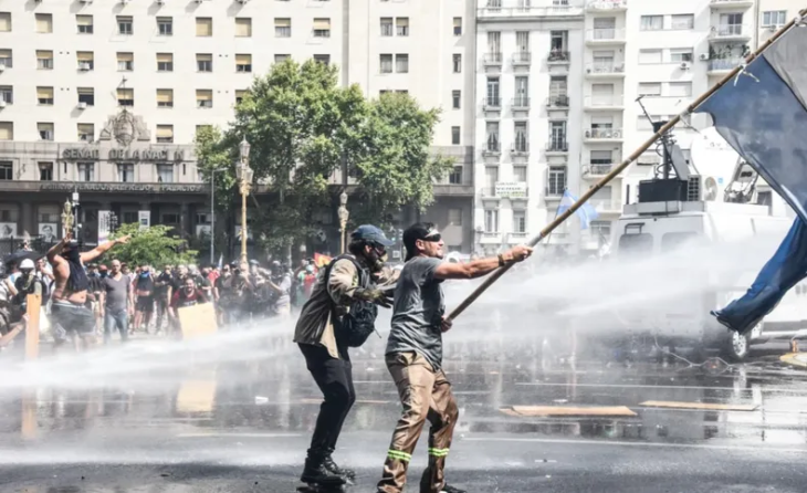Aunque la movilización contra la reforma laboral se desarrollaba de manera pacífica junto a organizaciones sociales y políticas, la situación cambió abruptamente. Según se observó en el lugar, algunos individuos con el rostro cubierto arrojaron piedras contra las vallas instaladas sobre la avenida Rivadavia como parte del operativo. La Policía Federal respondió con balas de goma, gases y la intervención del camión hidrante para dispersar a los agresores.