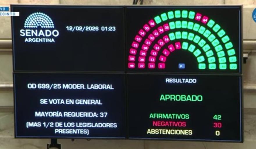 07:13 |El texto recibió 42 adhesiones y 30 rechazos en general. Hubo un guiño final de la Casa Rosada a los sindicatos y cámaras empresariales sobre aportes compulsivos.