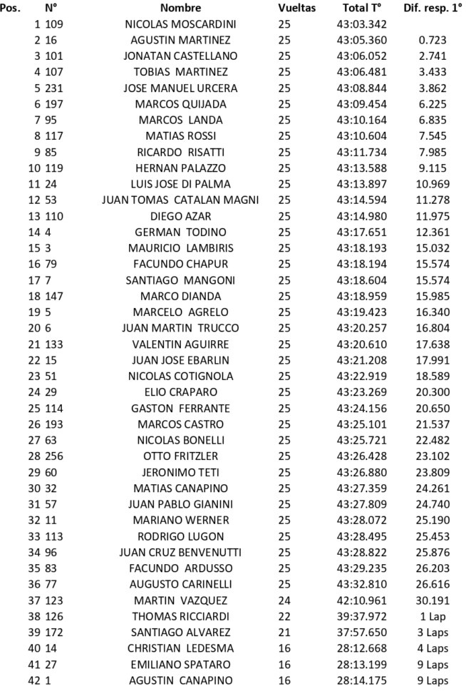 Moscardini volvió al 2º lugar en la 4ª vuelta, cuando el necochense abandonó por problemas en la caja de velocidades. A partir de ahí, Moscardini se dedicó a atacar al mendocino, que se había defendido con éxito en una Final accidentada y que tuvo 4 reanudaciones por los ingresos del auto de seguridad.