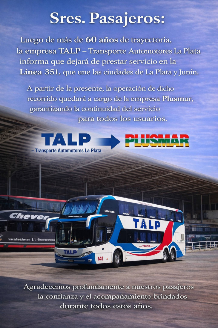 Unión Platense tomó la decisión de abandonar el recorrido de TALP que une La Plata - Junín pasando por intermedias (Cañuelas - Luján - Mercedes - Chivilcoy y demás) en unas semanas y el servicio entre ambas cabeceras y sus intermedias ahora será prestado por la empresa Plusmar.