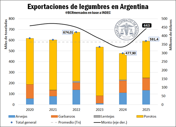 El desempeño exportador mostró comportamientos diferenciados según el cultivo en 2025. En el caso del poroto, el aumento de la producción se tradujo en un crecimiento interanual del 54% en las exportaciones medidas en dólares, aunque los valores aún se mantienen levemente por debajo del promedio reciente, brecha que podría cerrarse con el mayor volumen disponible en 2026. Las arvejas registraron una evolución particularmente favorable, con un incremento interanual del 20% y un récord de 59,6 millones de dólares exportados.