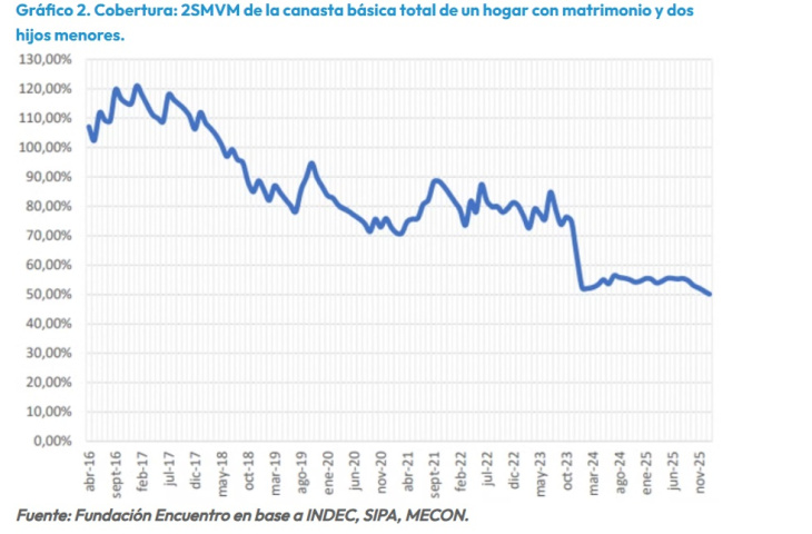 Según el análisis, el Salario Mínimo, Vital y Móvil alcanzó en febrero su menor capacidad de cobertura de la canasta básica total para un hogar tipo de cuatro integrantes en toda la serie disponible. Entre 2023 y 2026, indica el estudio, el ingreso mínimo perdió cerca del 35% de su poder de compra frente al costo de vida, lo que refleja una caída significativa de su capacidad para cubrir necesidades básicas.