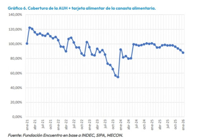 En cuanto a las prestaciones sociales, la Asignación Universal por Hijo combinada con la Tarjeta Alimentar también registra un retroceso sostenido: acumula ocho meses de caída real y perdió diez puntos de cobertura de la canasta alimentaria individual desde junio de 2025. En términos interanuales, la prestación muestra una reducción real del 8%.