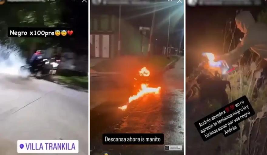 En uno de los videos se ve a un acompañante exhibiendo un arma mientras efectúa varios tiros. En otro, dos personas rocían con combustible una moto de gran porte, que pertenecía al joven fallecido y la prenden fuego en plena calle.