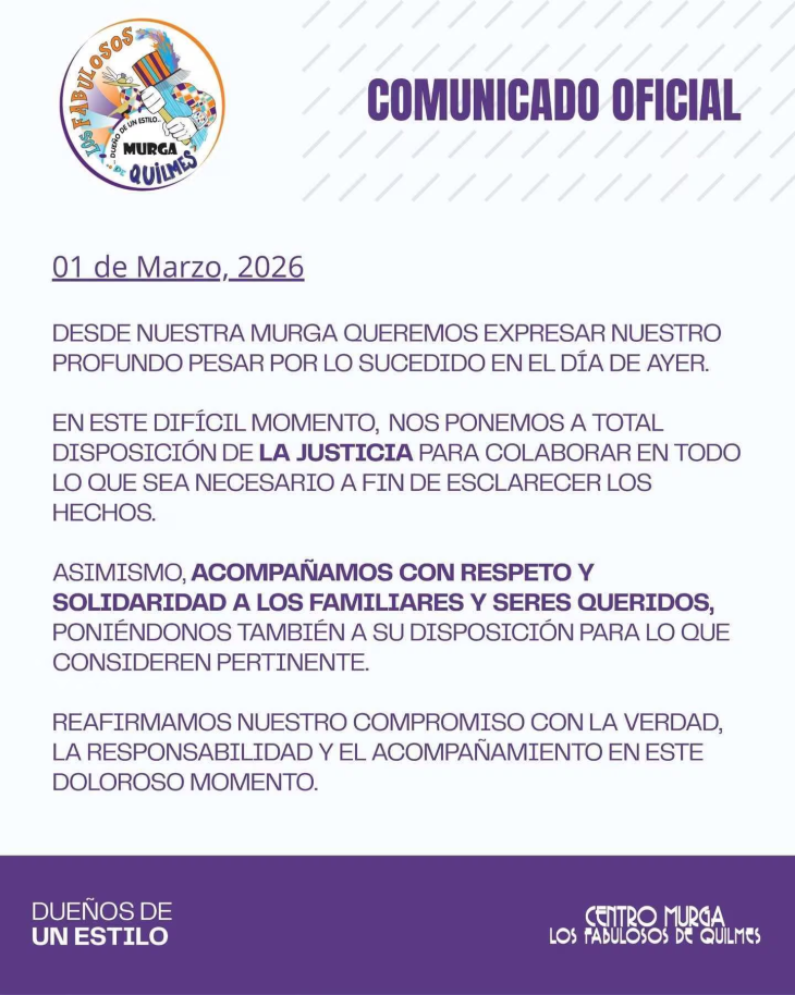 “Desde nuestra murga queremos expresar nuestro profundo pesar por lo sucedido. En este difícil momento nos ponemos a total disposición de la Justicia para colaborar en todo lo que sea necesario para esclarecer los hechos”, expresaron los organizadores de Centro Murga Los Fabulosos de Quilmes.