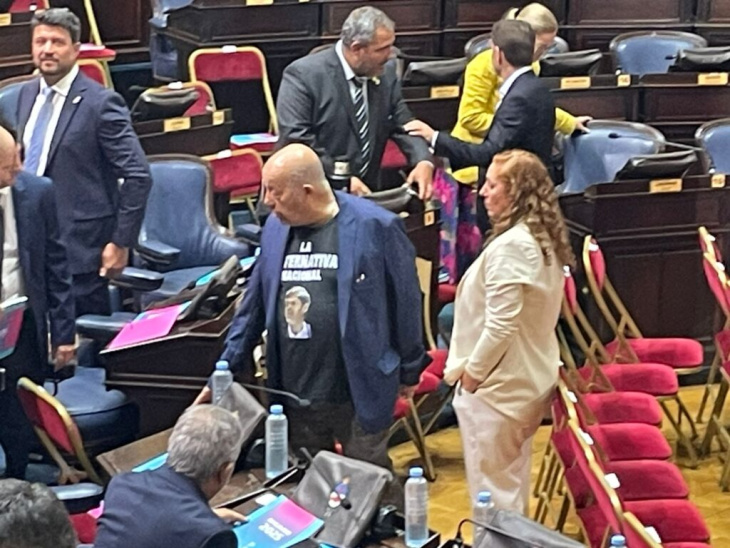 Hubo dos remeras que llamaron la atención y levantaron comentarios: La del senador peronista Jorge Paredi, que lució una casaca negra (bajo un saco sport) con la cara del gobernador y la leyenda “la alternativa nacional”. La otra remera que levantó algún susurro fue la del jefe de la bancada oficialista Facundo Tignanelli, quien llegó al recinto con una remera negra con la imagen del Indio Solari. Demasiado informal para una asamblea legislativa y para un jefe de bloque.