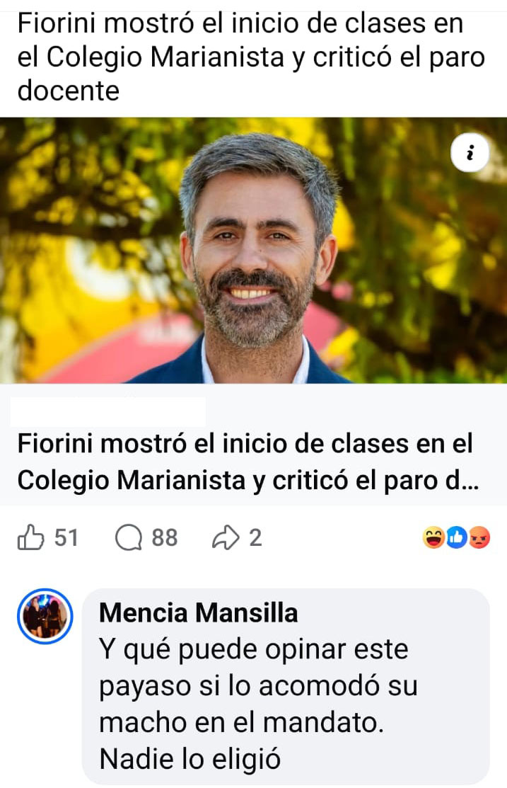 Fiorini, mostrando su desapego hacia los verdaderos trabajadores y sus salarios había manifestado: “Todos los chicos tienen el mismo derecho a educarse y cada día sin clases es una oportunidad que se pierde y que no vuelve”. Algo similar posteó su cuñado Petrecca desde su cargo de senador, quien percibe una dieta mensual 25 veces mayor que un maestro de escuela. Así es fácil opinar para la casta política, claro está.