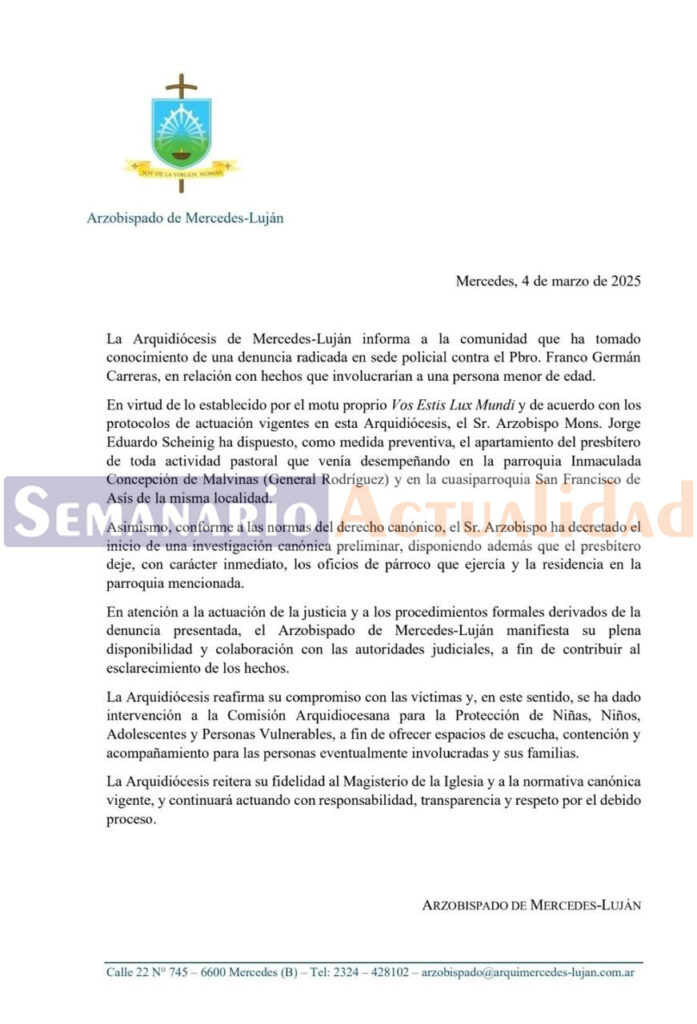 El presbítero Franco Carreras, de 42 años, fue detenido por orden de la Dra. Alejandra Rodríguez, titular de la UFI Nº 9 del Departamento Judicial de Moreno y General Rodríguez. Esta medida fue autorizada por el Juzgado de Garantías Nº 1 de la Dra. Adriana Julián y ejecutada por la DDI (Dirección Departamental de Investigaciones) durante la tarde del pasado martes 3 de marzo, según detalló el portal rodriguense Semanario Actualidad.