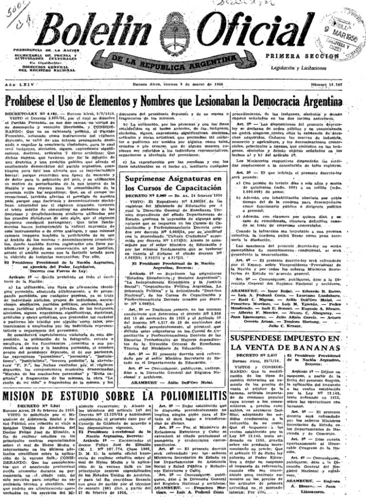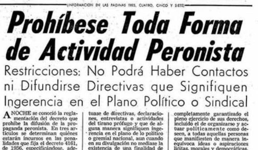 El Decreto Ley 4161, firmado el 5 de marzo de 1956 por el presidente de facto Pedro Eugenio Aramburu durante la dictadura autodenominada "Revolución Libertadora", prohibió la utilización de símbolos, imágenes y la mención de los nombres de Juan Domingo Perón y Eva Perón. Esta norma buscaba eliminar todo rastro del peronismo.
