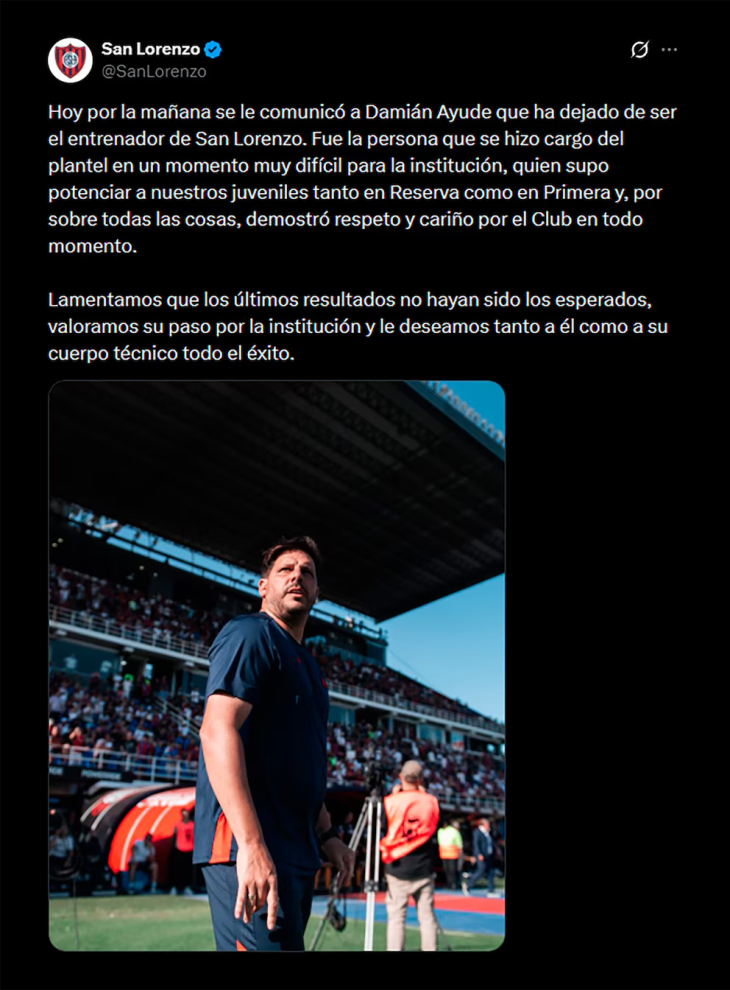 “Hoy por la mañana se le comunicó a Damián Ayude que ha dejado de ser el entrenador de San Lorenzo. Fue la persona que se hizo cargo del plantel en un momento muy difícil para la institución, quien supo potenciar a nuestros juveniles tanto en Reserva como en Primera y, por sobre todas las cosas, demostró respeto y cariño por el Club en todo momento. Lamentamos que los últimos resultados no hayan sido los esperados, valoramos su paso por la institución y le deseamos tanto a él como a su cuerpo técnico todo el éxito", informó el club mediante un comunicado difundido en redes sociales.